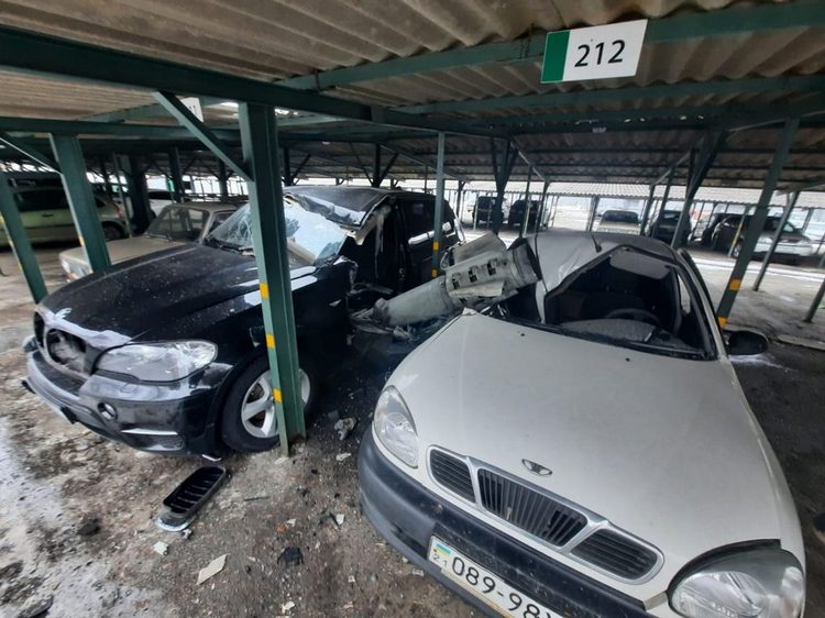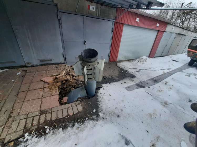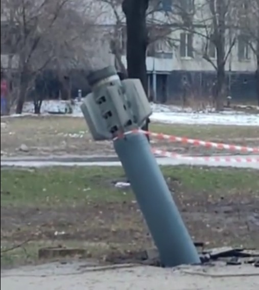 Последствия обстрела Харькова 28 февраля. Фото неразорвавшихся снарядов опубликовал портал «Мой Харьков». Как предполагается, они от системы залпового огня «Ураган».