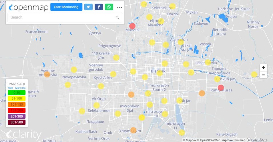 Посольство США в Кыргызстане также установило станцию. Информация обновляется каждый час. Индекс качества воздуха в районе дипломатической миссии — 91 (AQI).