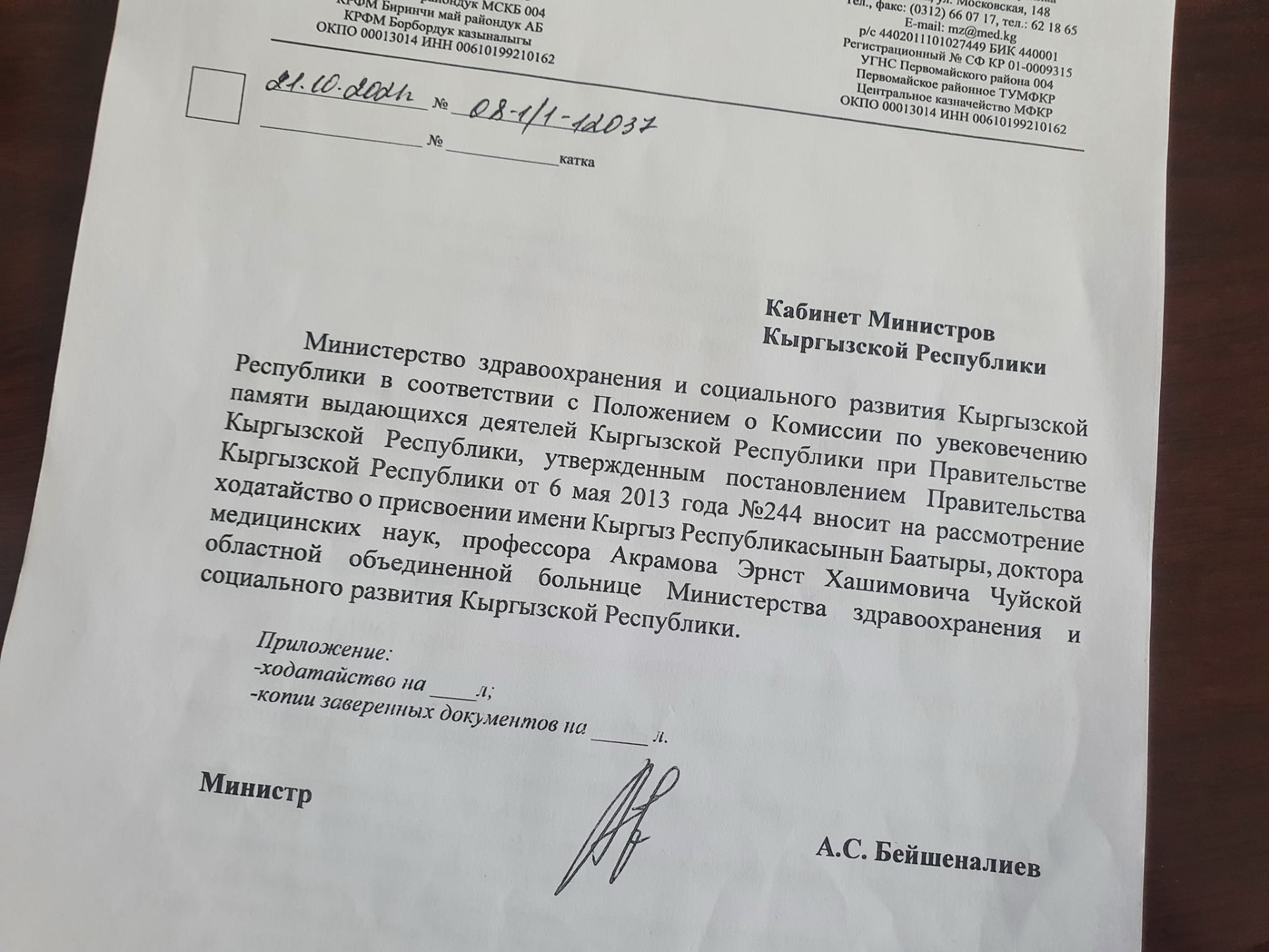 Министр здравоохранения Алымкадыр Бейшеналиев подписывал в прошлом году ходатайство о присвоении имени Эрнста Акрамова Чуйской областной объединенной больнице. Фотографию выложила на своей странице медиаэксперт в области медицины Елена Баялинова.