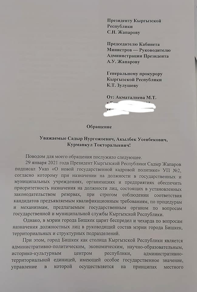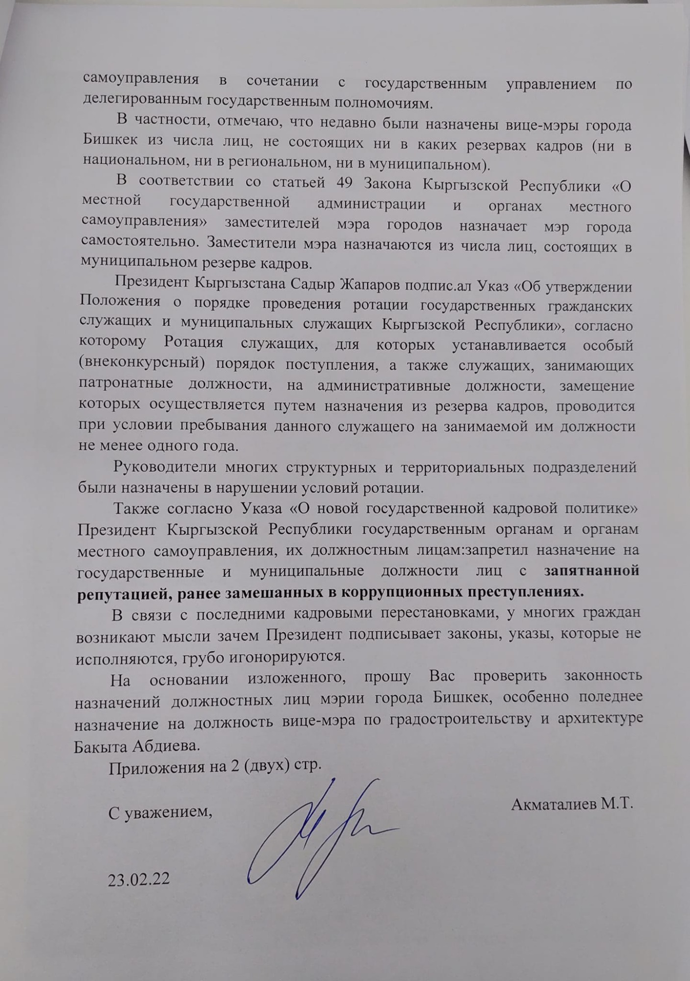Президента Садыра Жапарова просят проверить законность кадровых назначений в мэрии Бишкека. С письмом на имя главы государства, председателя кабинета министров и генпрокурора обратился житель столицы Марат Акматалиев.