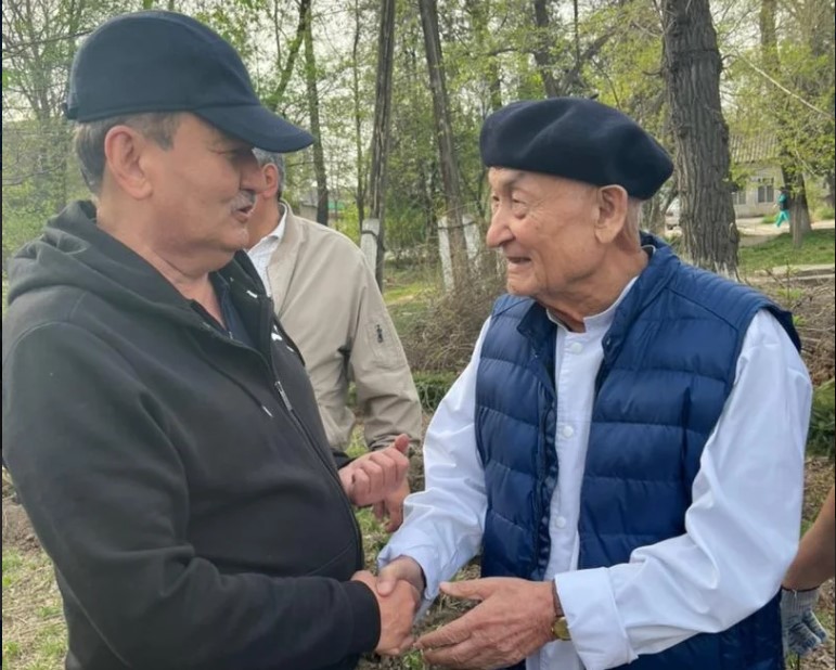 Несмотря на преклонный возраст, в мероприятии по очистке, благоустройству и озеленению прилегающих территорий принял участие и профессор Эрнст Акрамов. С министром они высадили ель и побеседовали о работе и развитии системы здравоохранения Кыргызстана.