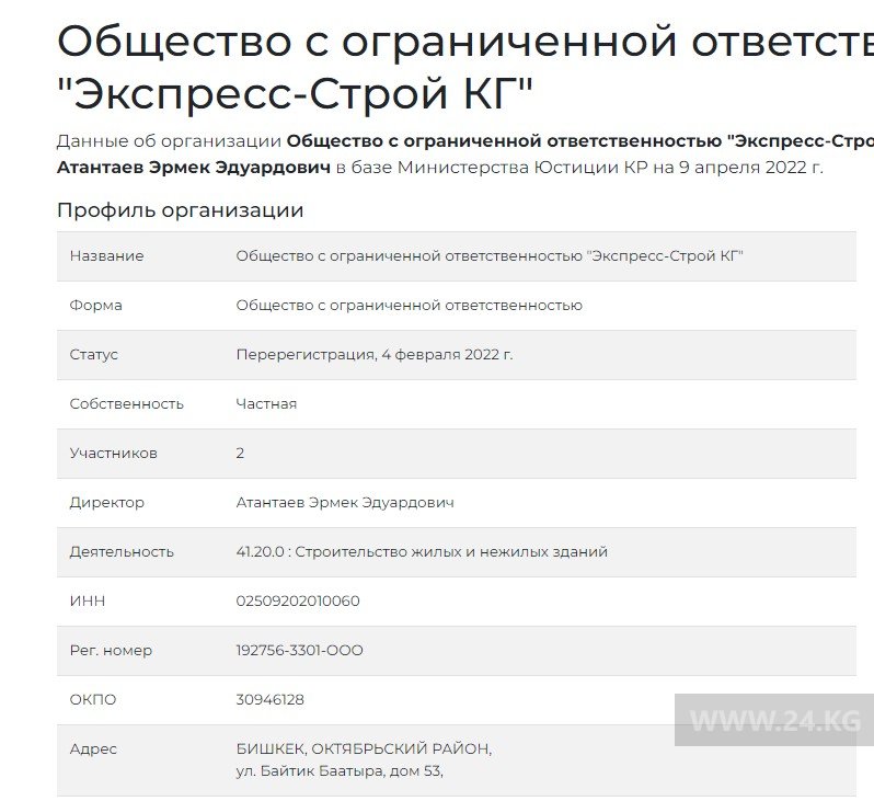 По данным Министерства юстиции, ОсОО «Экспресс-Строй КГ» прошло перерегистрацию буквально пару недель назад — 24 марта 2022 года. Сейчас руководителем и учредителем компании значится Кочкорбек Жуманазаров. Он является руководителем или учредителем еще нескольких компаний — ОсОО «Чок-Тал-Сити», ОсОО «Модуль Хаус», ОсОО «Евро Шпал», ОсОО «КЖ Глобал Компании», ОсОО «КЖ Инвест Компании».
