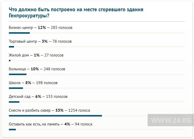 На месте сгоревшего здания Генпрокуратуры большинство читателей 24-kg.com хотят видеть сквер. Таковы результаты опроса, проведенного на сайте.