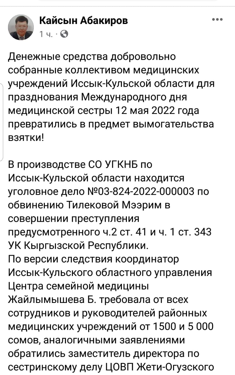 «Получается, что следователи Иссык-Кульской области добровольный сбор денег, посвященный Международному дню медицинской сестры, превратили в факт вымогательства взятки.