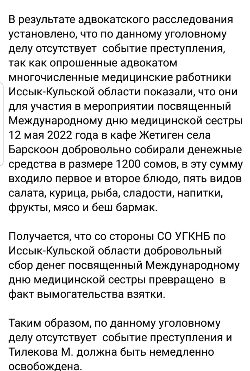 В результате адвокатского расследования установлено, что в уголовном деле отсутствует событие преступления: медики подтвердили, что для участия в мероприятии по случаю Международного дня медицинской сестры 12 мая в кафе «Жетиген» села Барскоон они добровольно собирали деньги, и не 5 тысяч, а по 1 тысяче 200 сомов. В эту сумму входили первое и второе блюдо, пять видов салатов, курица, рыба, сладости, напитки, фрукты, мясо и бешбармак.