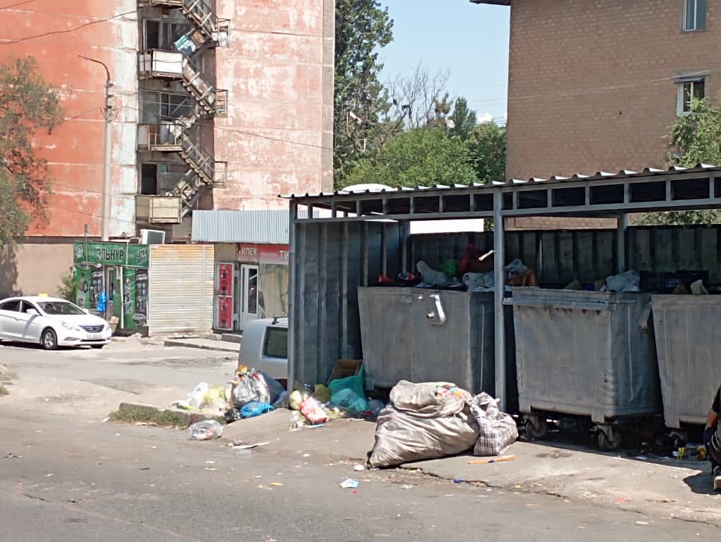 Первая точка — микрорайон «Кок-Жар». Видно, что отходы из контейнеров тут вывозят, но возле площадки навалены ветки, встречаются и мусор, высохшая помойная жижа, вонь от которой ощущается на несколько метров. Похожую картину наблюдали и в 5-м микрорайоне, недалеко от школы № 3. Контейнеры относительно пустые, а территория вокруг завалена ветками и другим мусором. А вот дальше по улице Миррахимова в сторону Юнусалиева баки, видимо, сегодня не очищали.