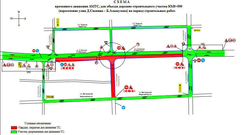 Отрезок трассы будет закрыт от улицы Алыкулова до улицы Абаканской по южной стороне. На схеме указан объезд участка, где проводится реконструкция.