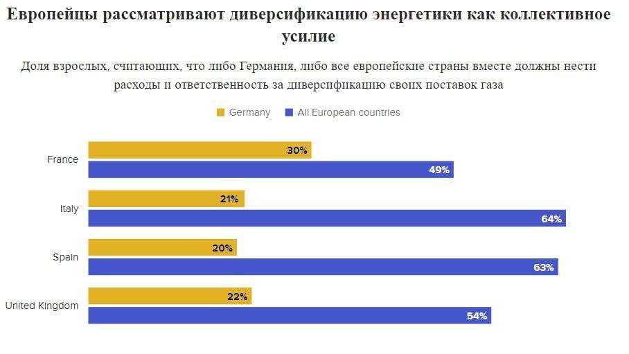 Согласно данным исследования Morning Consult, большинство европейцев считают, что их правительства несут совместную ответственность за диверсификацию энергетических ресурсов Европы (от 49 до 54 процентов). От 22 до 30 процентов считают, что ответственность за это должна нести Германия.