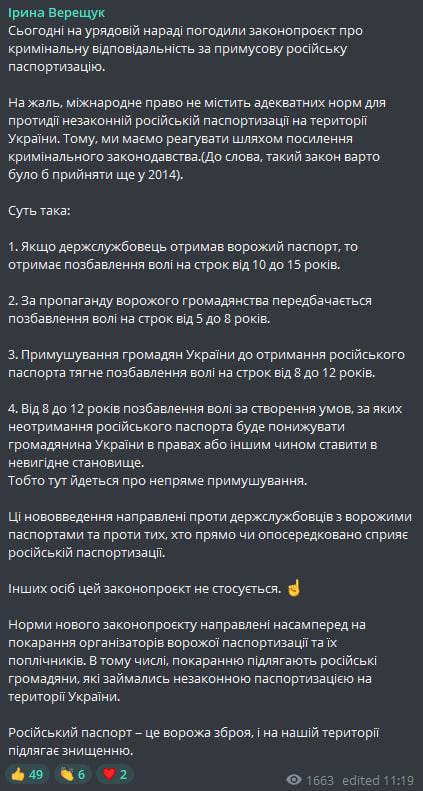 «К сожалению, международное право не содержит адекватных норм по противодействию незаконной российской паспортизации на территории Украины. Поэтому мы должны реагировать путем усиления уголовного законодательства», — написала она.