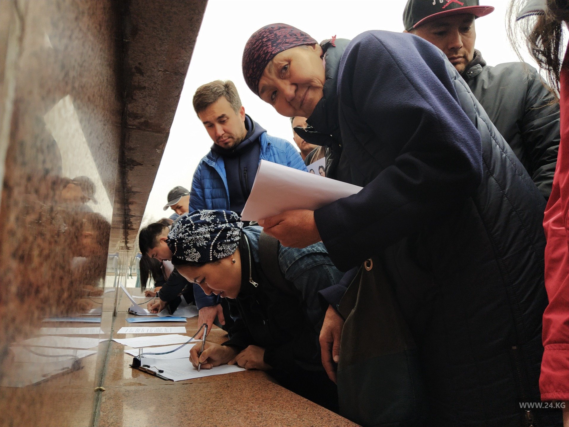 Вышедшие на мирную акцию в Бишкеке подписали петицию, призывающую власти отменить передачу Кемпир-Абада и прекратить политические репрессии против своих оппонентов. Текст петиции и бланки для подписей разложили под постаментом памятника Манасу на площади Ала-Тоо.