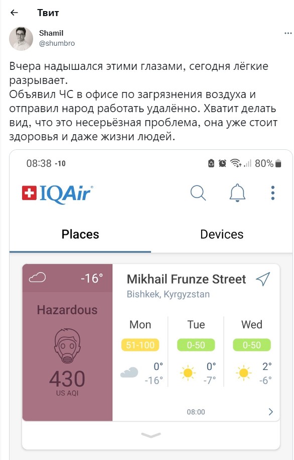 Накануне Бишкек возглавил рейтинг крупнейших городов мира World Air Quality по загрязнению воздуха. Столица Кыргызстана на первом месте с показателем воздуха как «очень нездоровый». В некоторых районах столицы уровень достигал «опасного».