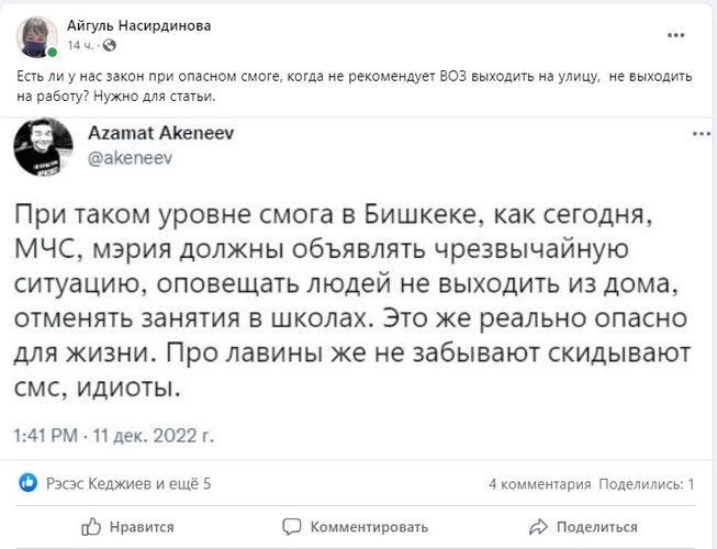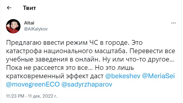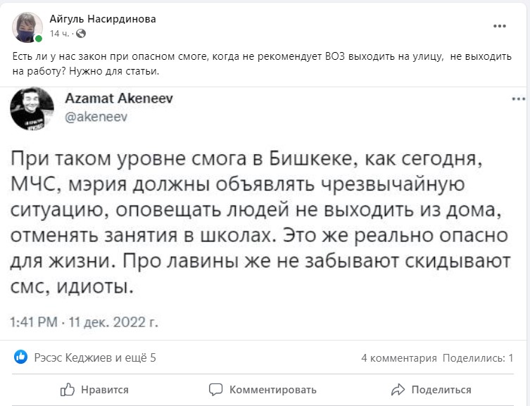 Пользователи социальных сетей предлагают объявить в Бишкеке режим чрезвычайной ситуации из-за смога в столице.