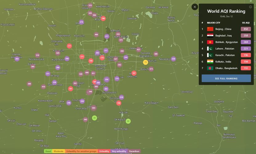 Сейчас Бишкек находится на третьем месте рейтинга World Air Quality по загрязнению воздуха. Столица Кыргызстана на первом месте с показателем воздуха как «очень нездоровый».Индекс качества воздуха на 10.40, по данным сайта, составляет 269 (AQI).