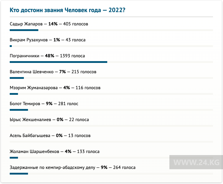 Читатели 24-kg.com проголосовали за человека года и антигероя — 2022. В преддверии Нового года мы запустили опрос среди читателей и пользователей соцсетей, почти половина участников (48 процентов, или 1 тысяча 393 человека) отдали голоса за пограничников. Они признаны героями года.