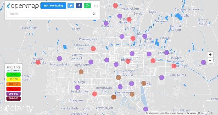Посольство США в Кыргызстане также установило станцию. Информация обновляется каждый час. Индекс качества воздуха в районе дипломатической миссии «опасный» — 463 (AQI).