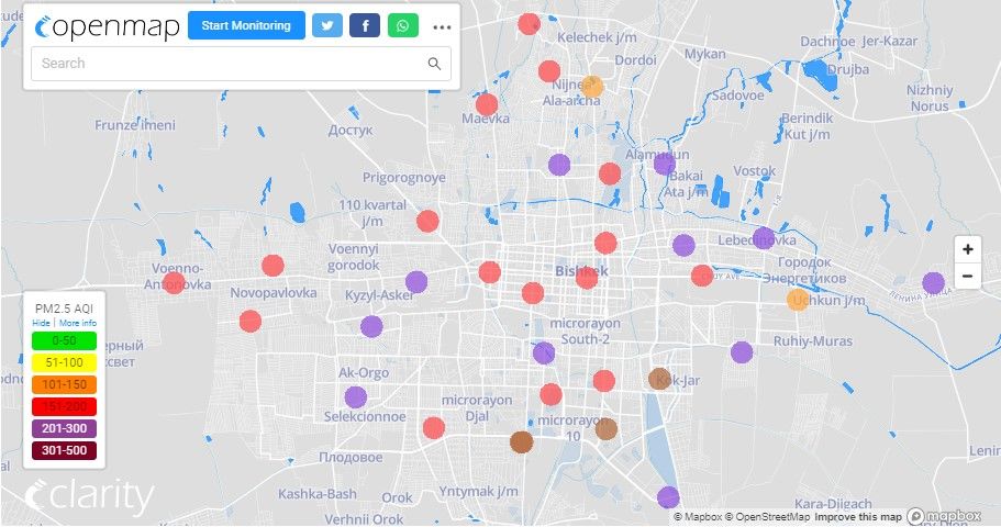 Посольство США в Кыргызстане также установило станцию. Информация обновляется каждый час. Индекс качества воздуха в районе дипломатической миссии «опасный» — 385 (AQI).