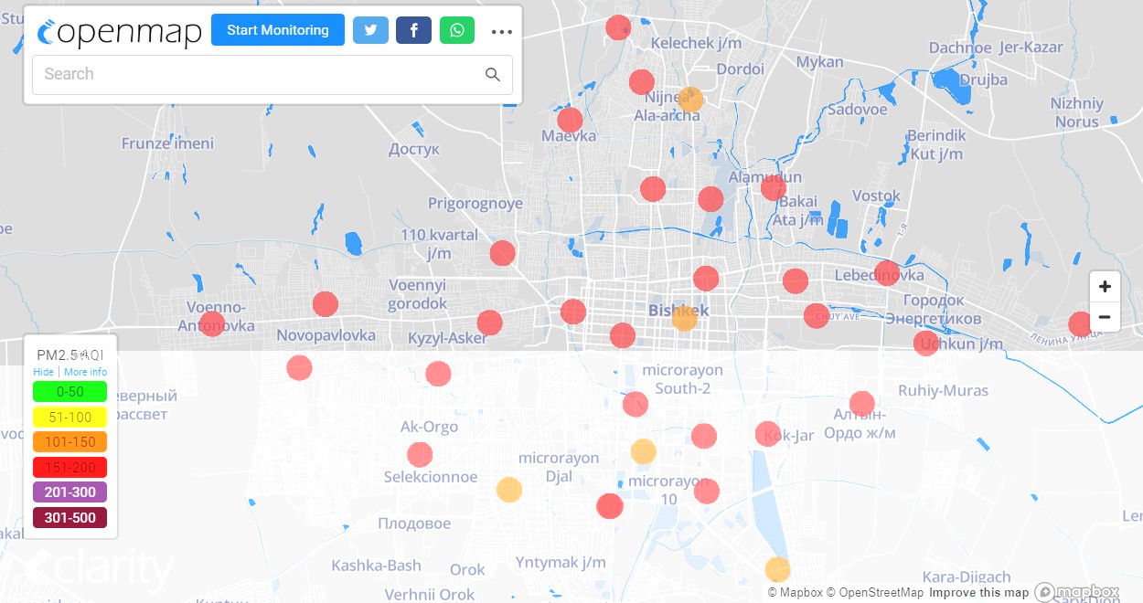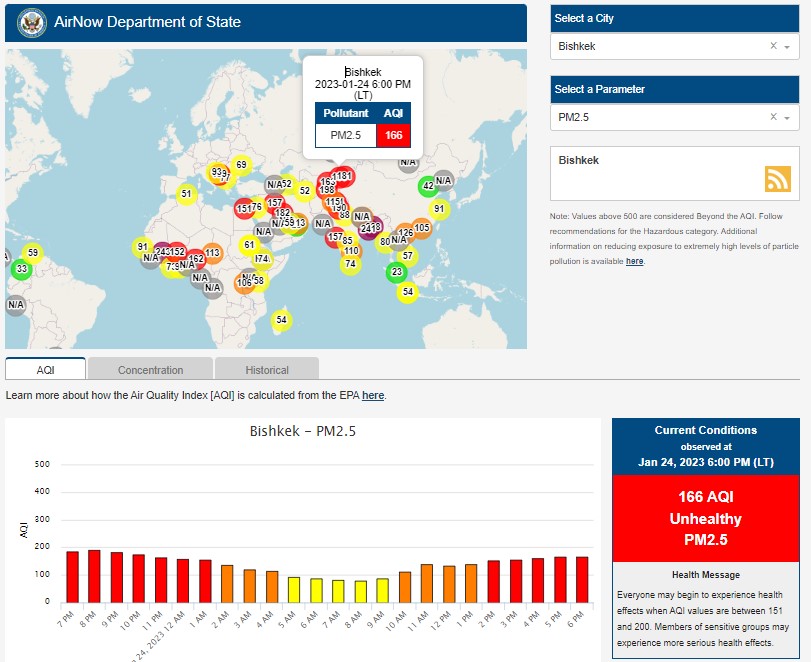 Посольство США в Кыргызстане также установило станцию. Информация обновляется каждый час. Индекс качества воздуха в районе дипломатической миссии «нездоровый» — 166 (AQI).