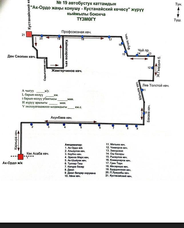 Маршрут № 19 — жилмассив «Ак-Ордо» — улица Кустанайская, протяженность 34 километра, интервал — 7 минут. Этот маршрут будут обслуживать старые автобусы марки «Ютонг». Выделено 17 автобусов.