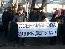 Протестующие – ее сторонники, близкие из Таласской области. Они требуют справедливого решения и настаивают на возвращении Эльмире Джумалиевой мандата.