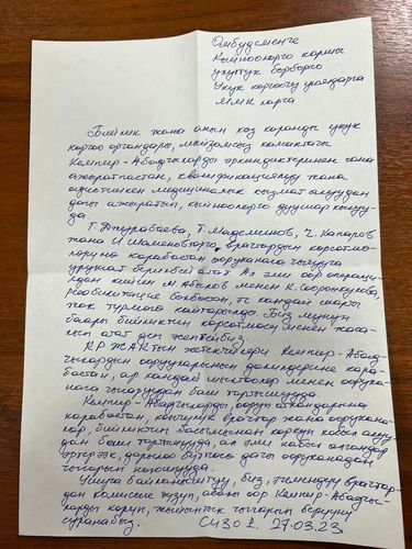 Они просят принять меры и направить на лечение Гульнару Джурабаеву, Таалайбека Мадеминова, Ильгиза Шаменова и Чингиза Капарова. В письме также говорится о том, что Клару Сооронкулову и Мамбетжунуса Абылова вернули в СИЗО, несмотря на перенесенные ими ранее тяжелые операции, что можно расценивать как пытки.