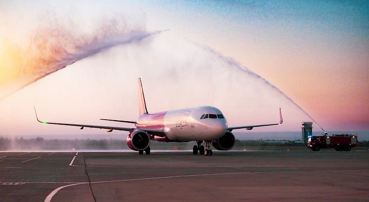 В аэропорту «Манас» первый рейс из Абу-Даби встретили водяной аркой.