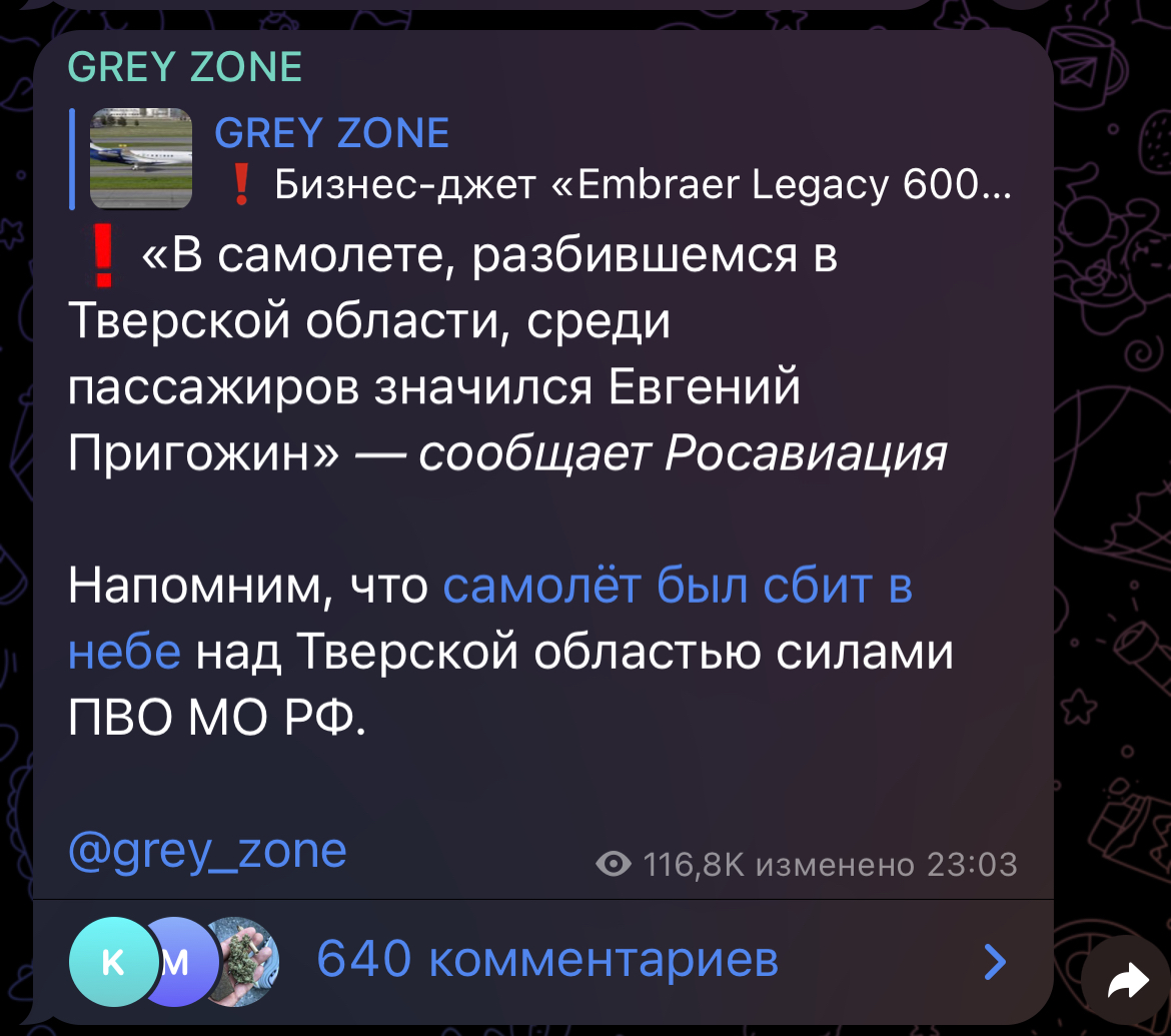 Позже со ссылкой на Росавиацию Telegram-канал Grey Zone написал: Евгений Пригожин числился среди пассажиров.