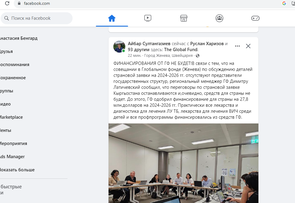 По его словам, это связано с тем, что на совещании в Глобальном фонде в Женеве по обсуждению деталей страновой заявки на 2024-2026 годы отсутствуют представители государственных структур Кыргызстана.