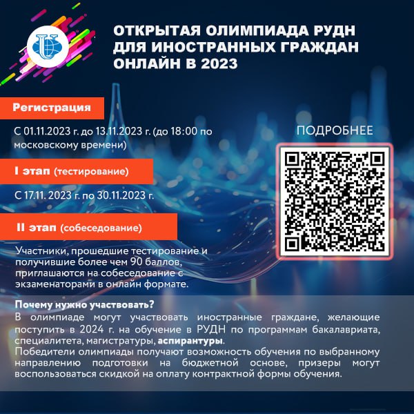 С 1 по 13 ноября пройдет регистрация на олимпиаду. К участию приглашаются граждане, желающие поступить в РУДН по программам бакалавриата, специалитета, магистратуры либо аспирантуры.