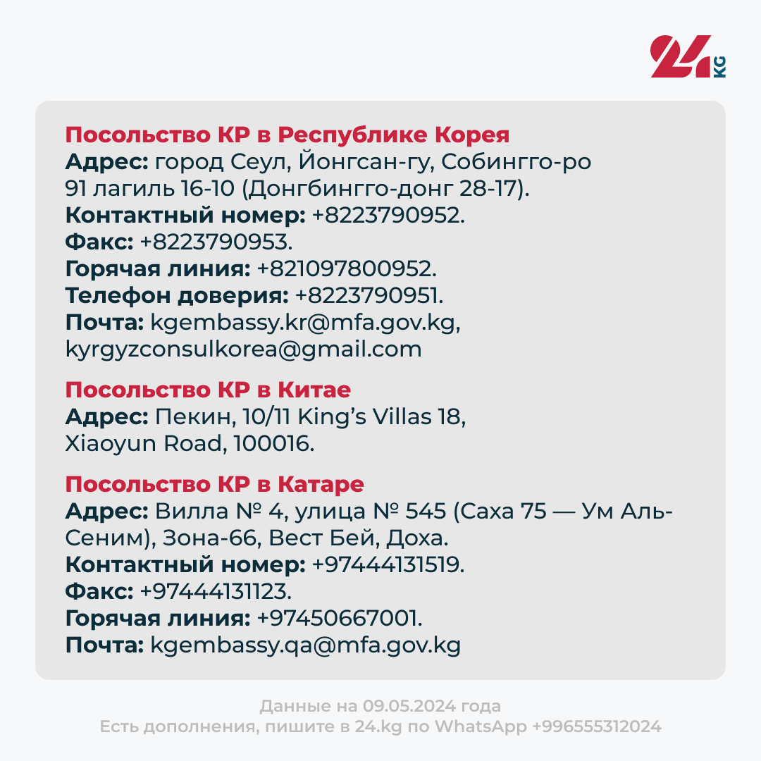 24.kg собрало контакты дипломатических представительств Кыргызстана в разных странах. В материале использованы данные сайта Министерства иностранных дел КР.