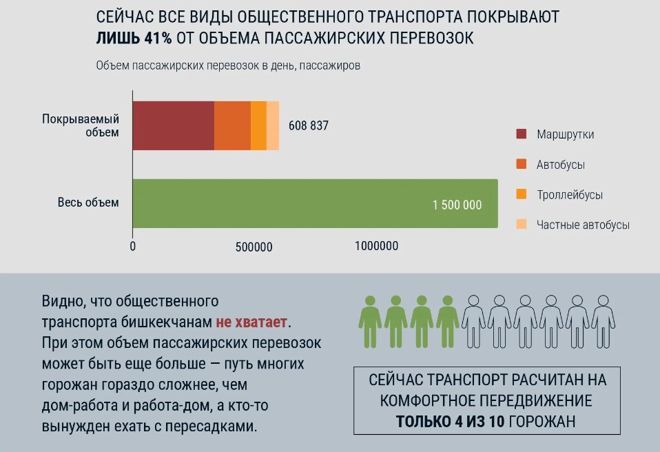 «Сейчас все виды перевозки (автобусы муниципальные и частные, троллейбусы и микроавтобусы) покрывают лишь 41 процент от объема перевозок. Сейчас транспорт рассчитан на комфортное передвижение только четырех из десяти горожан», — отмечают в инициативе.