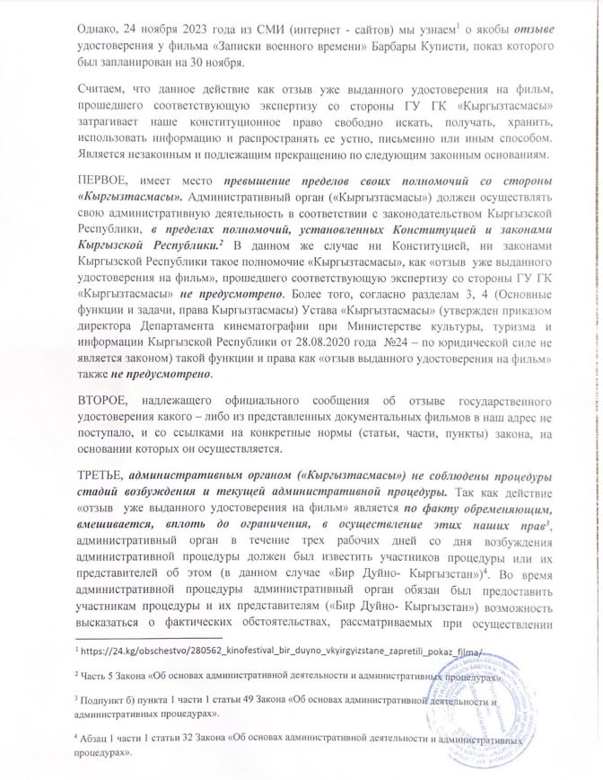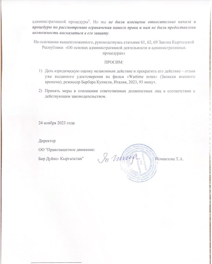 По их данным, 14 ноября киноцентр «Кыргызтасмасы» выдал государственные удостоверения на документальные картины, представленные движением. В списке была и лента «Записки военного времени» Барбары Куписти. Однако 24 ноября из СМИ они узнали об отзыве удостоверения на показ.