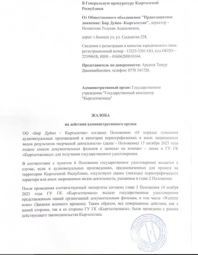 Правозащитное движение «Бир дуйно» направило жалобы генеральному прокурору и омбудсмену после запрета фильма «Записки военного времени», который входит в программу кинофестиваля. Об этом 24-kg.com сообщили правозащитники.