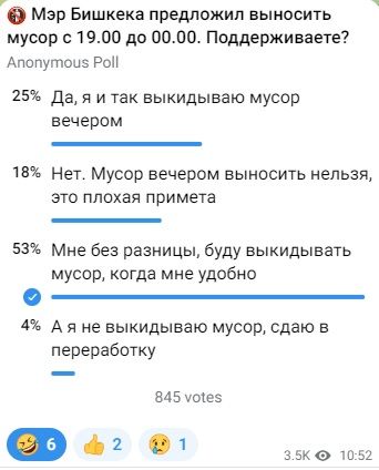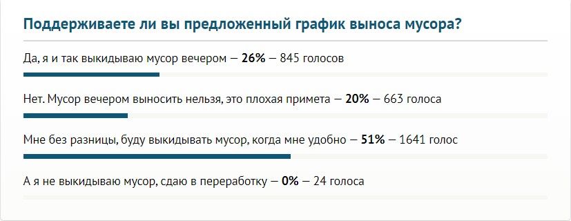 Редакция 24-kg.com предложила читателям высказать мнение по этому поводу. В итоге большинство респондентов — 51 процент (1 тысяча 641 голос) отметили, что будут выносить мусор в удобное им время. Еще 20 процентов (663 человека) высказались против инициативы, а 26 процентов (845 голосов) выбрали вариант «Я и так выношу мусор по вечерам». Среди читателей есть 24 человека, которые не выкидывают мусор, а сдают его в переработку.