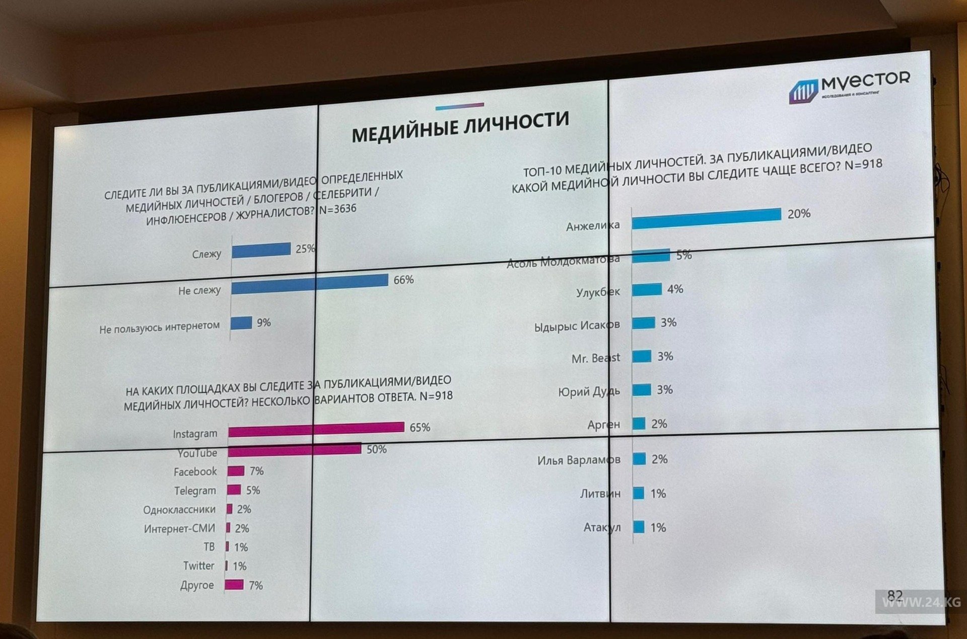 Большинство кыргызстанцев ответили, что не следят за публикациями известных личностей — так ответили 66 процентов опрошенных. 25 процентов следят за жизнью селебрити и делают они это чаще через Instagram (65 процентов) и YouTube (50 процентов опрошенных).
