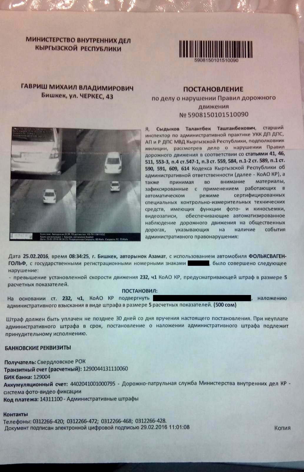 Указано, что нарушители ПДД уже несколько дней получают так называемые письма счастья - постановления о нарушении ПДД. С 29 февраля владельцам авто, нарушившим ПДД на автодороге Бишкек - Кара-Балта, отправлено более трех тысяч квитанций об оплате.