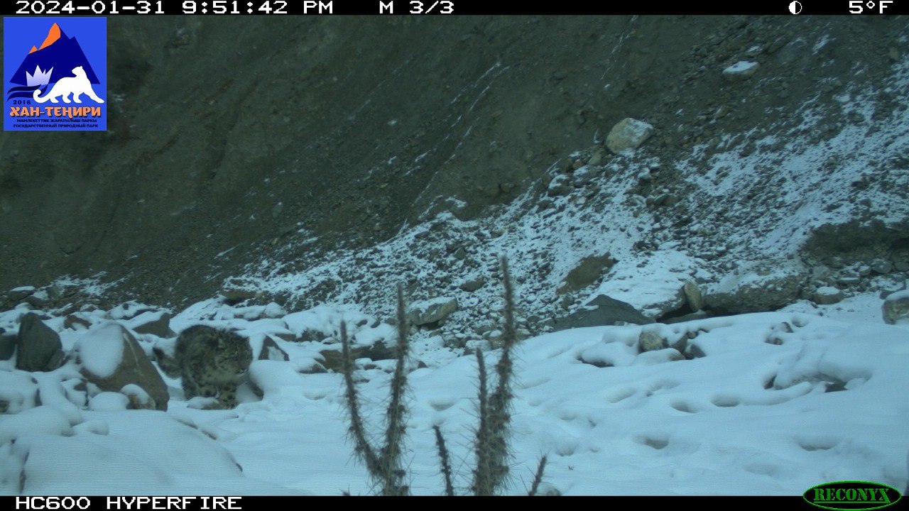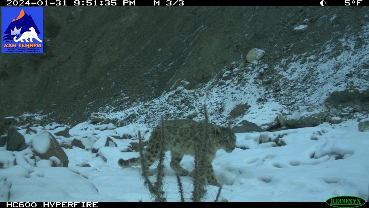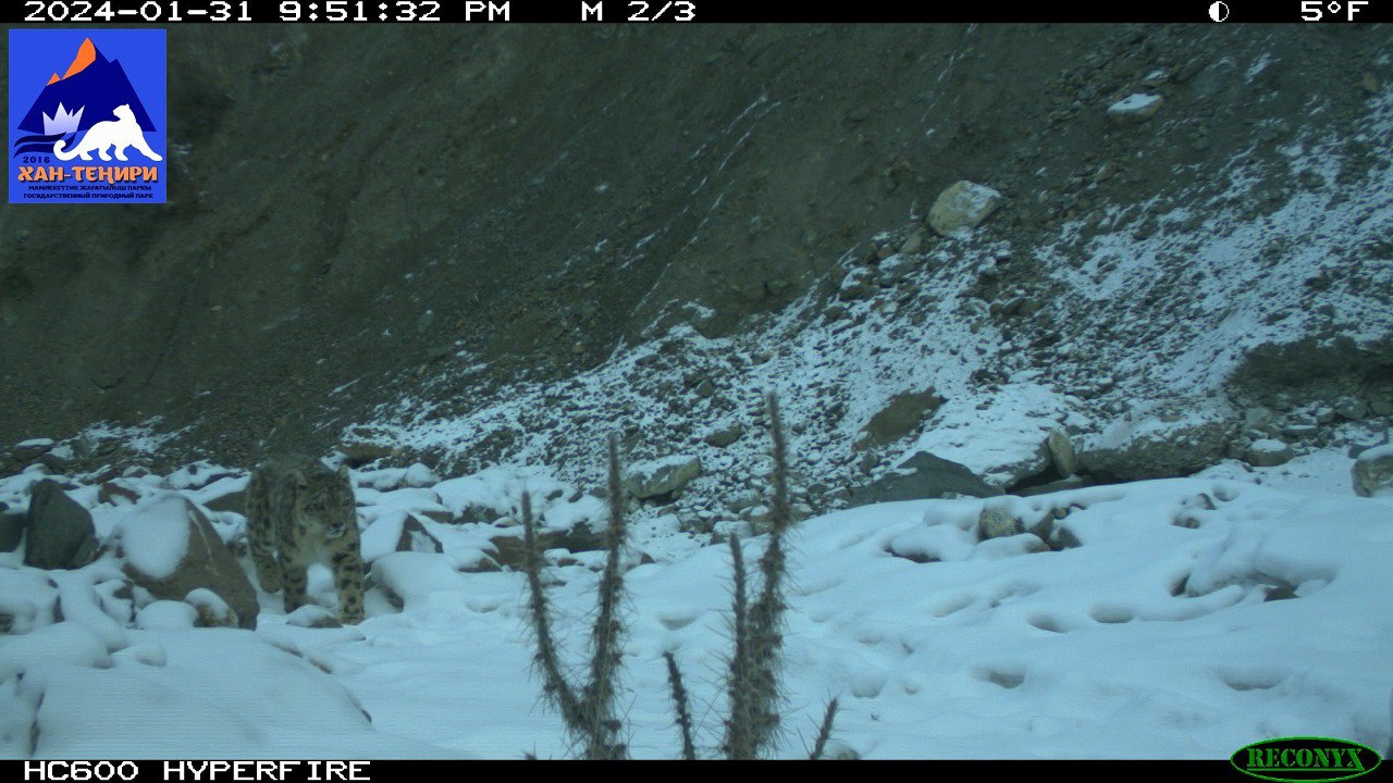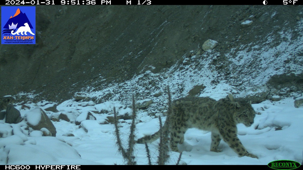 На территории государственного национального природного парка «Хан-Тенгри» фотоловушки зафиксировали самку барса с детенышем. Кадры опубликовало Министерство природных ресурсов, экологии и технического надзора.