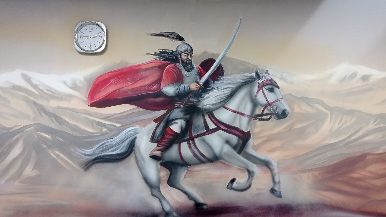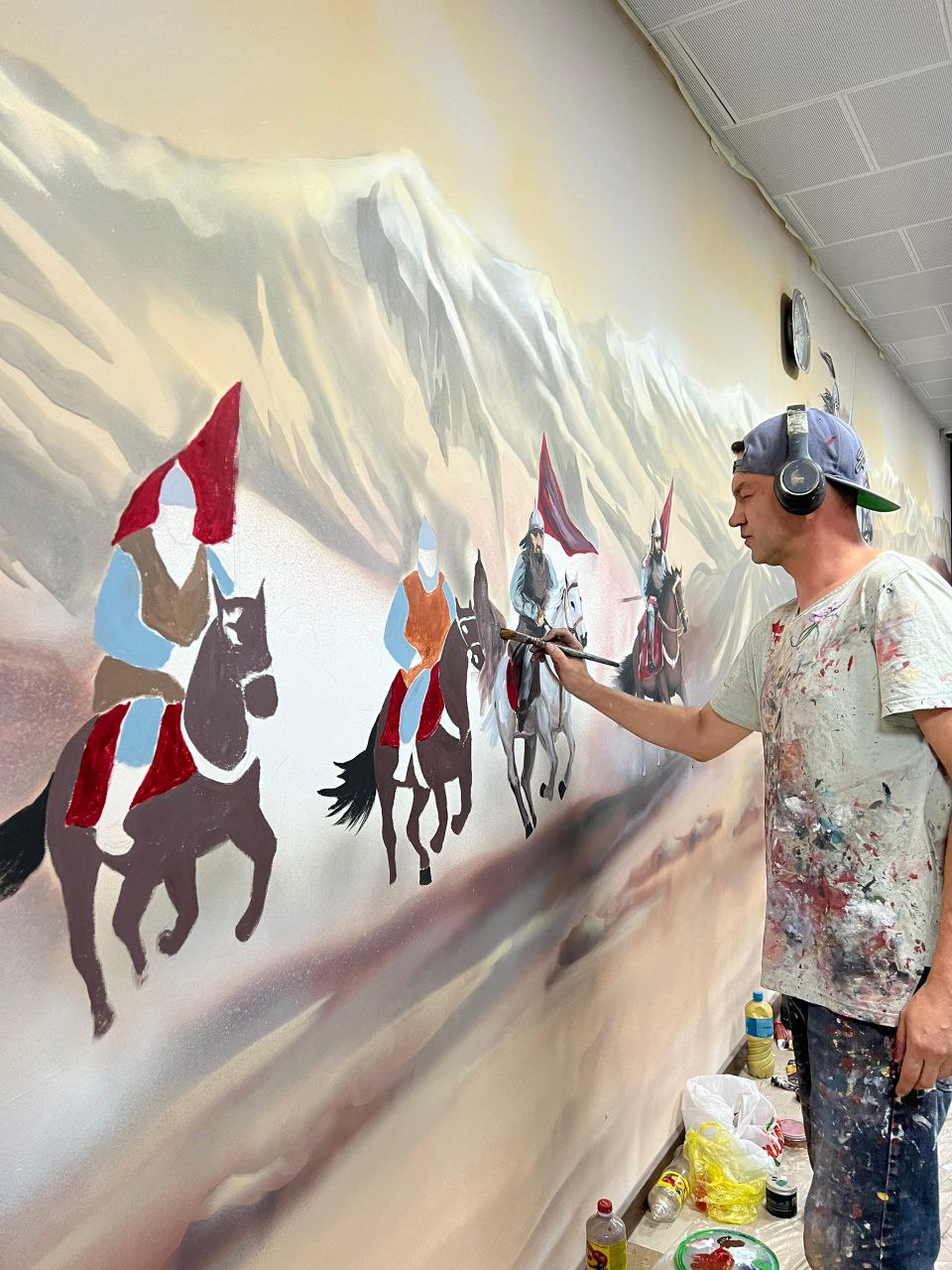 «Еще одна новость из серии наших новых творений: в зале вылета внутренних рейсов международного аэропорта «Манас» мы сделали новый мурал на тему эпоса «Манас». Теперь миллионы людей могут видеть изображение с великим героем и вспомнить о принадлежности к кыргызской культуре. Работу выполнили за четверо суток», — рассказал он.