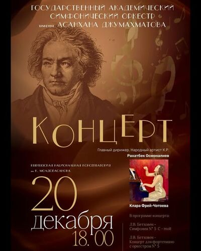 Не пропустите это знаменательное событие, наполненное классической музыкой в исполнении Государственного академического симфонического оркестра имени Асанхана Джумахматова. Главный дирижер — Народный артист КР Рахатбек Осмоналиев, солистка — пианистка Клара Фрей-Чотоева.