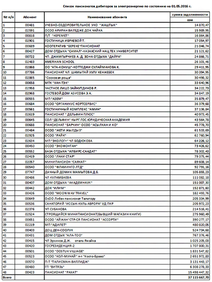 Согласно данным, среди крупных дебиторов числятся пансионаты: «Витязь» с задолженностью свыше 6 миллионов сомов; «Талисман-Виллидж» - свыше 3 миллионов сомов; «Коста Брава» - свыше 2 миллионов сомов; Госрезиденция №2 и «Достук-Виллидж» с задолженностью свыше 1 миллиона сомов.