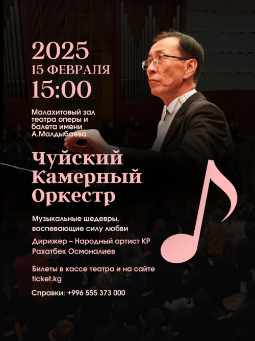 Чуйский камерный оркестр подарит вам незабываемый концерт, посвященный самому прекрасному чувству на земле — любви. В его исполнении под руководством народного артиста КР Рахатбека Осмоналиева прозвучат величайшие музыкальные шедевры, воспевающие силу любви, страсти и нежности.