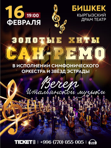 Вы окунетесь в атмосферу легендарного фестиваля «Сан-Ремо» вместе с симфоническим оркестром под управлением дирижера Жаната Абылкасымова (Казахстан) в исполнении солистов оперы и звезд эстрады. Вас ждут самые яркие и любимые песни и мелодии победителей фестиваля: Адриано Челентано, Тото Кутунньо, Аль Бано и Ромина Пауэр, Джанни Моранди, Эроса Рамазотти и других.