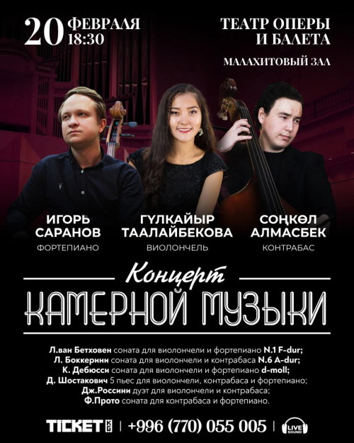 Зрители услышат классические произведения Людвига ван Бетховена, Луиджи Боккерини, Клода Дебюсси, Дмитрия Шостаковича и других в исполнении Гулкайыр Таалайбековой (виолончель), Сонкола Алмасбека (контрабас) и Игоря Саранова (фортепиано).