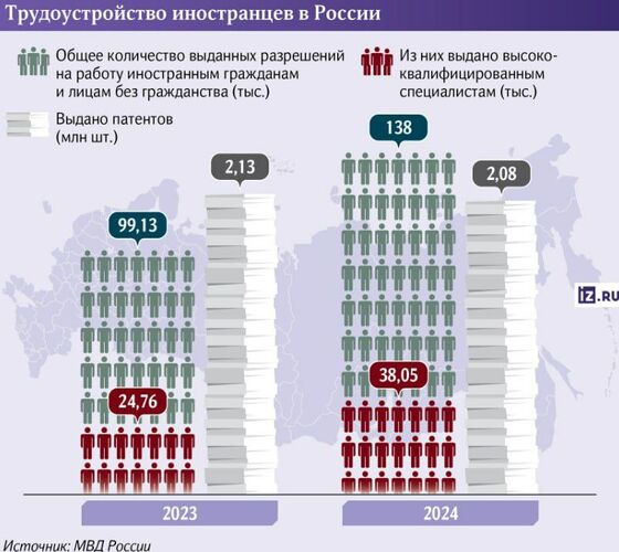 В целом выдано 138 тысяч разрешений на работу — это на 40 процентов больше показателя 2023-го. Эксперты объясняют это тем, что иностранцы стали чаще проходить процедуры легализации в связи с ужесточившейся за последнее время миграционной политикой.