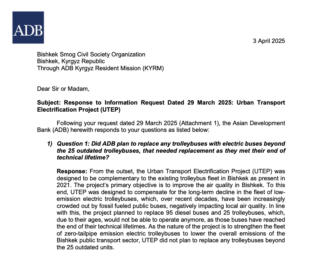 Директор отдела Восточной, Центральной и Западной Азии энергетического сектора АБР Чунхо Хван в официальном письме сообщил, что в соответствии с изначальной целью проекта банк предусматривал замену 95 дизельных автобусов и только 25 троллейбусов.
