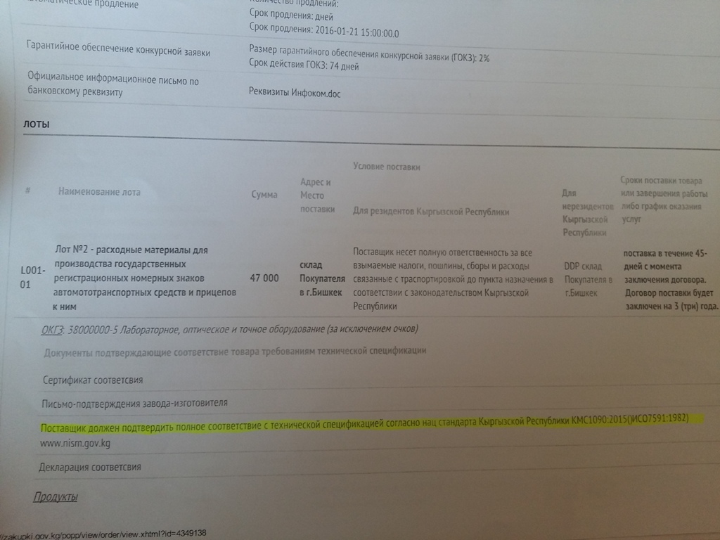 Также, согласно конкурсной документации, одним из требований был пункт, что «поставщик должен предоставить полное соответствие с технической спецификацией согласно нацстандарту КР КМС1090:2015 (ИСО7591:1982)».