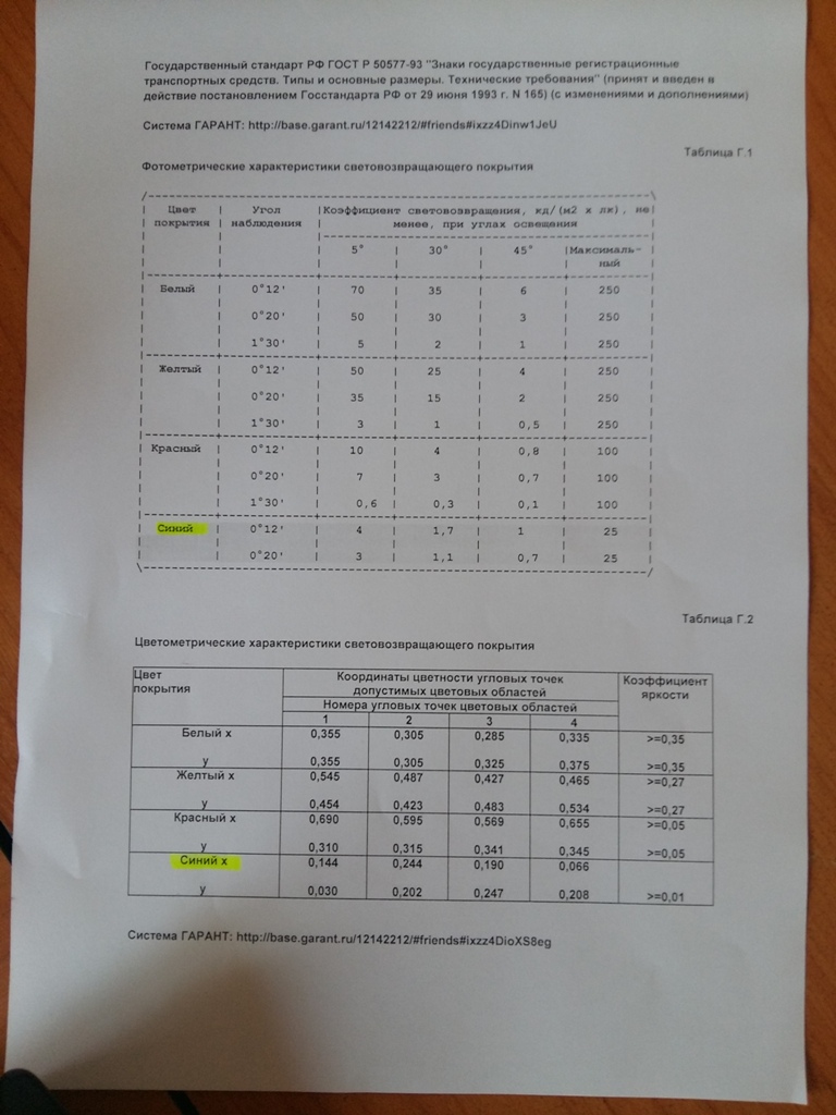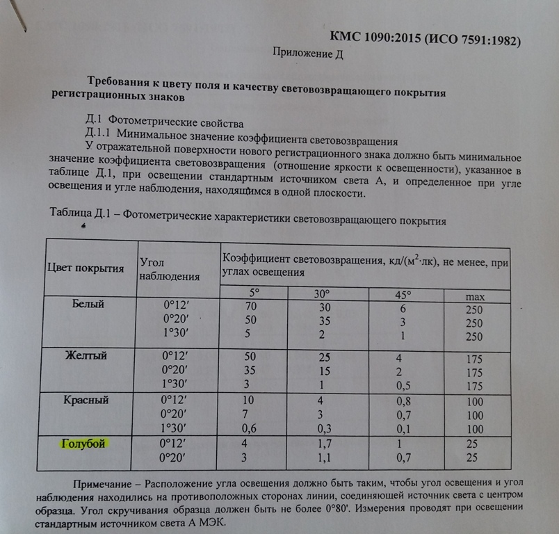 Также, проанализировав Национальный стандарт КР, разработанный ГРС, выяснилось, что в приложении «Д» вышеуказанного документа фотометрические характеристики световозвращающего покрытия полностью скопированы с Государственного стандарта РФ ГОСТ Р505077-93 «Знаки государственные регистрационных транспортных средств. Типы и основные размеры. Технические требования».