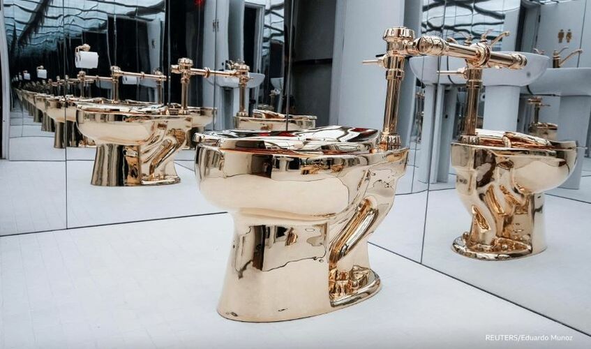 Унитаз из 18-каратного золота создал итальянский художник-концептуалист Маурицио Каттелан. Он сделал два таких унитаза со смывными механизмами. Однако в 2019 году один из них украли из экспозиции художника во дворце Бленейм в английском графстве Оксфордшир.