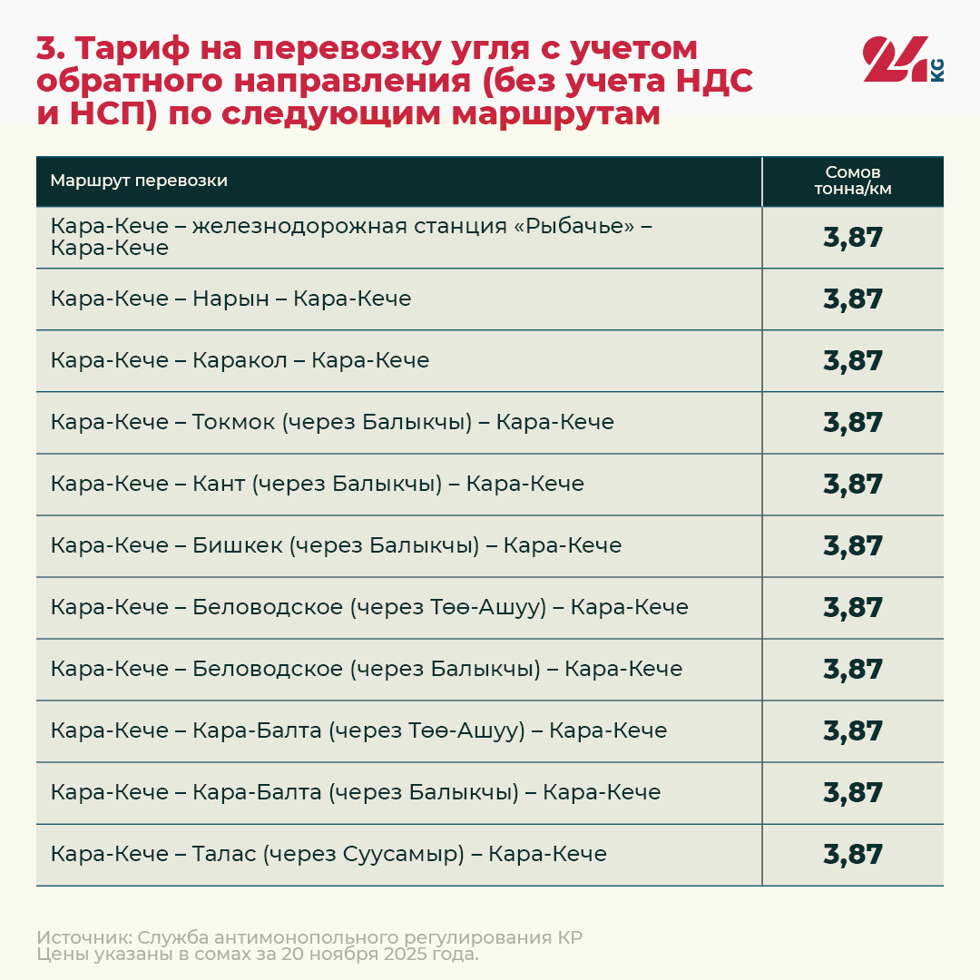 Помимо этого, установили стоимость перегрузки угля на железнодорожный транспорт на погрузочно-разгрузочной площадке Балыкчи. Тариф составляет 262,60 сома за тонну без учета НДС и НСП.