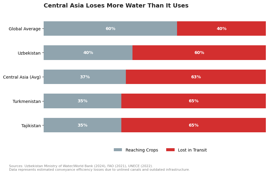 По оценке авторов материала, Ташкент, Бишкек, Алматы, Астана и Душанбе пока не достигли уровня катастрофы, но уверенно движутся в опасном направлении. Главные причины — стремительное таяние горных ледников, хронически изношенная инфраструктура и расточительное потребление воды, прежде всего в аграрном секторе. До 90 процентов воды в регионе уходит на орошение, причем большая часть теряется в открытых каналах еще до того, как достигает полей. В некоторых районах до 40 процентов ресурсов буквально испаряются по пути.