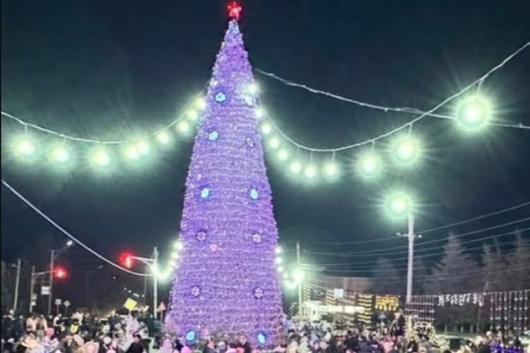 В середине декабря зажглись огни на елке в Баткене. На центральной площади разместили 20-метровую красавицу, аккурат возле областной администрации. Главное отличие этой елки от других – в ее цвете. Вместо стандартной темно-зеленой расцветки баткенская елка имеет сиренево-фиолетовое одеяние, а также яркое современное декорирование.
